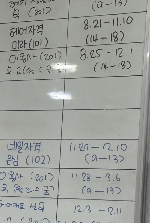 헤어자격증 과정(속성반) 25.10.16 ~ 26.1.7 14:00~18:00 / 월~금